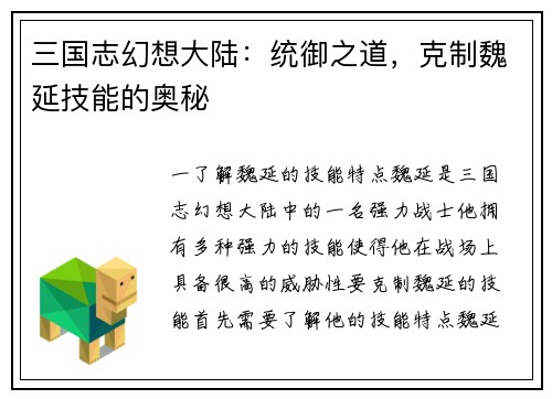 魏延是三国志幻想大陆中的一名强力战士,他拥有多种强力的技能,使得他在战场上具备很高的威胁性。要克制魏延的技能,首先需要了解他的技能特点。魏延的主要技能包括“狂斩”、“破军”和“烈火”。狂斩是他的主动技能,可以对敌方单位造成大量伤害;破军是他的被动技能,可以增加自身的攻击力;烈火是他的终极技能,可以对敌方单位造成范围伤害。了解了这些技能特点,才能有针对性地制定对策。